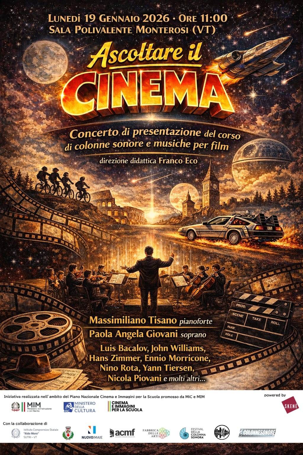 La seconda edizione del percorso didattico “Ascoltare il cinema. Per una pedagogia della musica applicata alle immagini”, promosso dal compositore Franco Eco, si apre ufficialmente con un concerto di presentazione in programma lunedì 19 gennaio, alle ore 11, presso la Sala Polivalente di Monterosi (VT).