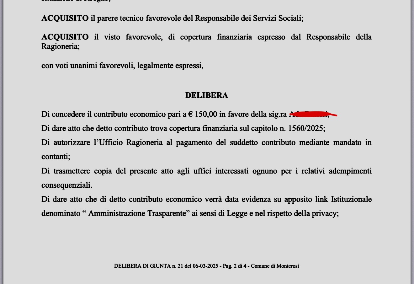 Resta la macchia delle presunte irregolarità: il sindaco ha ammesso di aver superato il tetto massimo di 500 euro per alcune borse lavoro, arrivando a 600. Una scelta definita testualmente un “peccato mortale”. Poi c’è il nodo della privacy, col quale vorrebbe giustificare la mancata trasparenza: Giglietti ha dichiarato che gli atti dell’assistente sociale sarebbero riservati, eppure il Comune continua a pubblicare delibere publiche in cui nomi e cognomi sono ben visibili (l’ultima mostra chiaramente 150 euro destinati a una cittadina il 6 marzo 2025). Un controsenso, si smentiscono da soli.