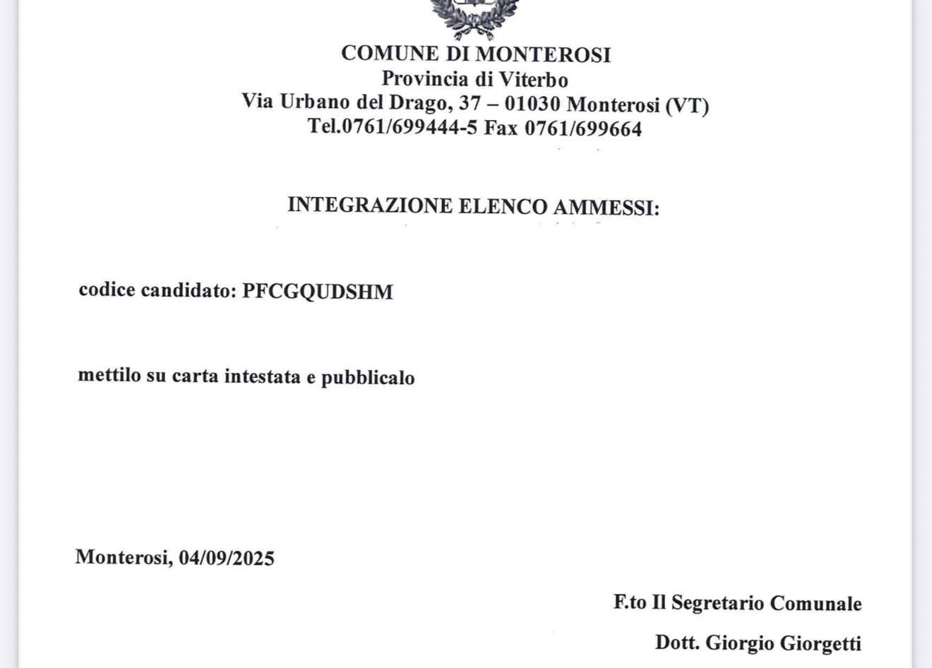 Domattina, 5 settembre alle ore 8 presso la sala polivalente, i candidati dovranno sostenere la prova scritta. Ma solo poche ore fa, in data 4 settembre 2025, l’Albo Pretorio ha pubblicato un’integrazione dell’elenco degli ammessi (pubblicazione n. 432/2025), firmata dal Segretario comunale dott. Giorgio Giorgetti.