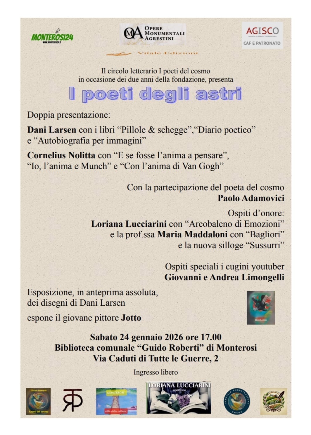 Il titolo dell’incontro, I poeti degli astri, racchiude il senso dell’iniziativa: un percorso che intreccia poesia, introspezione e arte visiva, attraverso una doppia presentazione editoriale che vedrà protagonisti due autori. Da un lato Dani Larsen, che presenterà i volumi Pillole & schegge, Diario poetico e Autobiografia per immagini; dall’altro Cornelius Nolitta, con le opere E se fosse l’anima a pensare, Io, l’anima e Munch e Con l’anima di Van Gogh. Due percorsi differenti, accomunati da una ricerca che attraversa l’animo umano e il rapporto tra parola e visione.