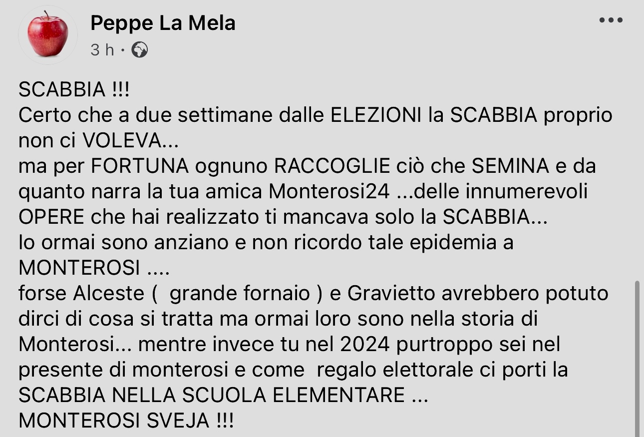 Ora il signore in questione si è riattivato ed è tornato per diffondere allarme sociale su un tema delicato come quello di un caso di scabbia a scuola. In una classe della scuola primaria di Monterosi è infatti stato riscontrato un caso di scabbia: un evento come tanti ne accadono in tutte le scuole d’Italia, su cui il Sindaco Giglietti - che, lo ricordiamo, è anche medico - è prontamente intervenuto assumendo tutte le iniziative volte a salvaguardare la salute dei ragazzi e delle loro famiglie. Insomma, questi signori non si fermano davanti a niente, passano anche sopra la pelle dei bambini per raggiungere gli scopi della lista.
