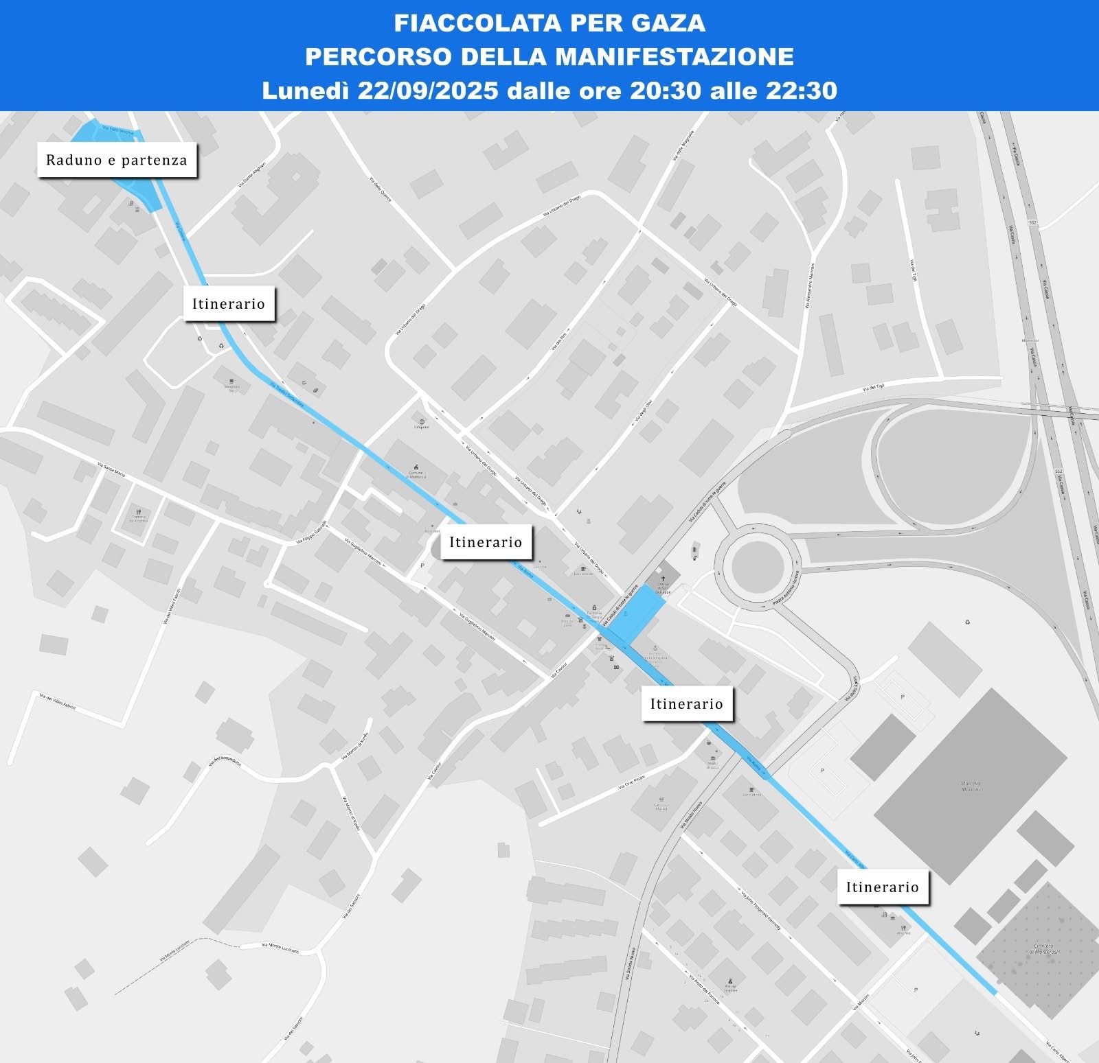 Questa sera, dalle ore 20.30 alle ore 22.30, si terrà la manifestazione “Fiaccolata per Gaza”.
