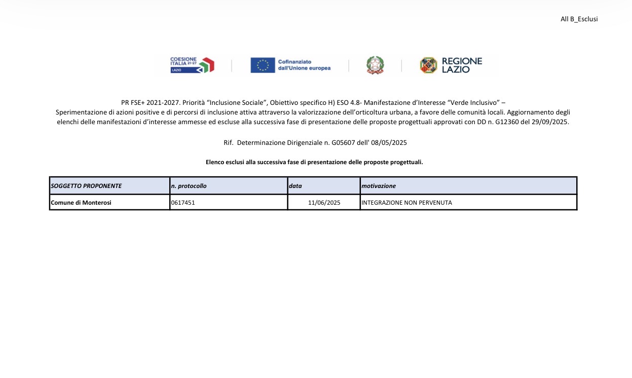 Secondo quanto riportato negli atti pubblicati dalla Regione, la motivazione dell’esclusione è “mancata trasmissione dell’integrazione richiesta”, un dettaglio che ha comportato la bocciatura automatica della candidatura.