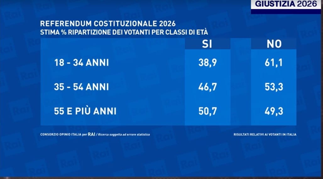 A pesare in modo decisivo è anche il dato generazionale, sono i giovani ad aver fatto vincere il NO, con un vantaggio superiore ai 20 punti tra i 18 e i 34 anni (61,1% contro 38,9%). Un segnale politico forte, che indica una distanza netta tra le nuove generazioni e la proposta sostenuta dal governo, mentre solo tra gli over 55 il SÌ riesce a prevalere, e peraltro di misura.