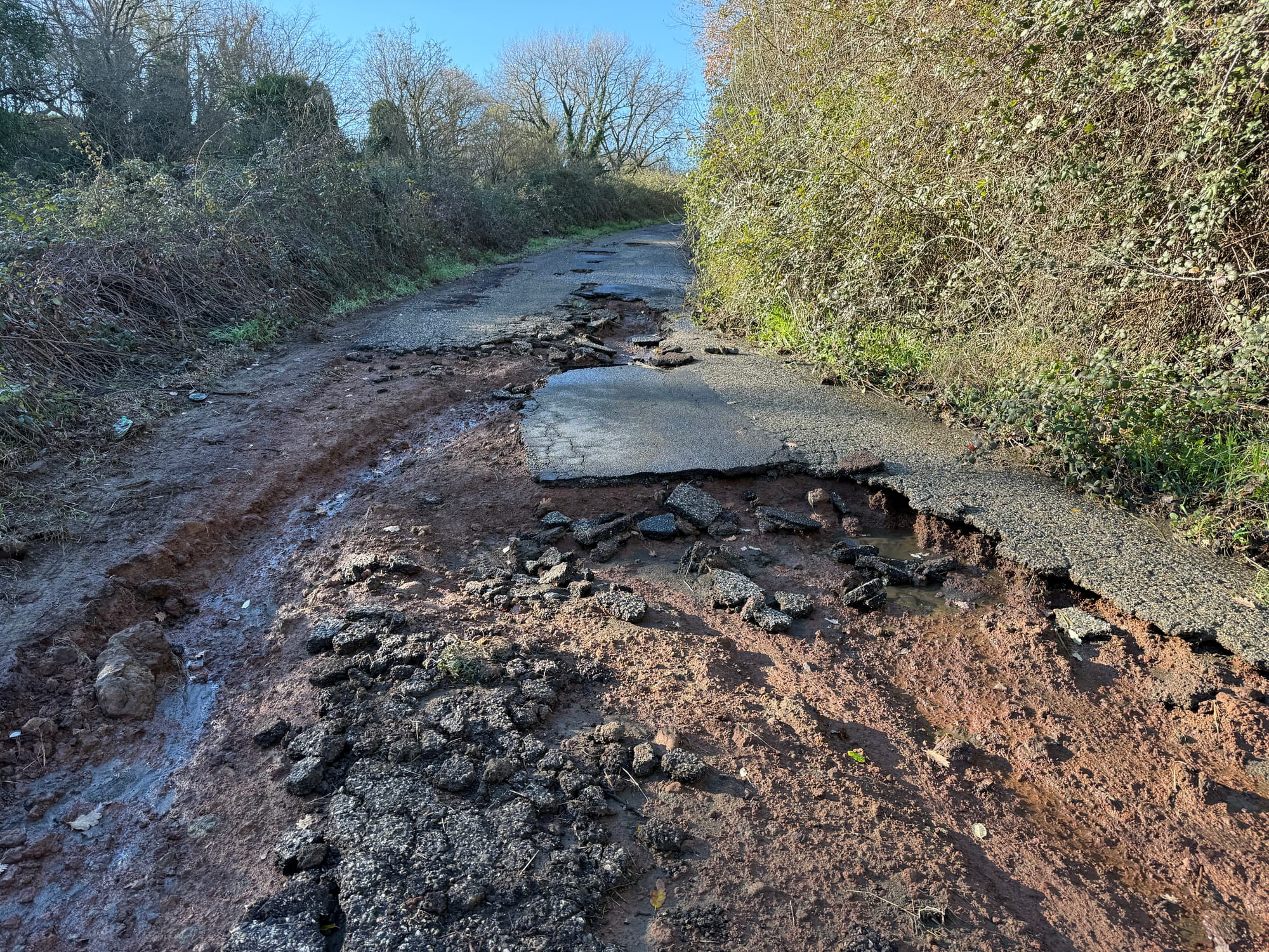 Le intense precipitazioni hanno provocato l’erosione del manto stradale, con veri e propri crateri, il trascinamento di detriti e fango e il convogliamento delle acque verso la curva più bassa, fino a viale di Terre dei Consoli, rendendo il tratto particolarmente pericoloso.