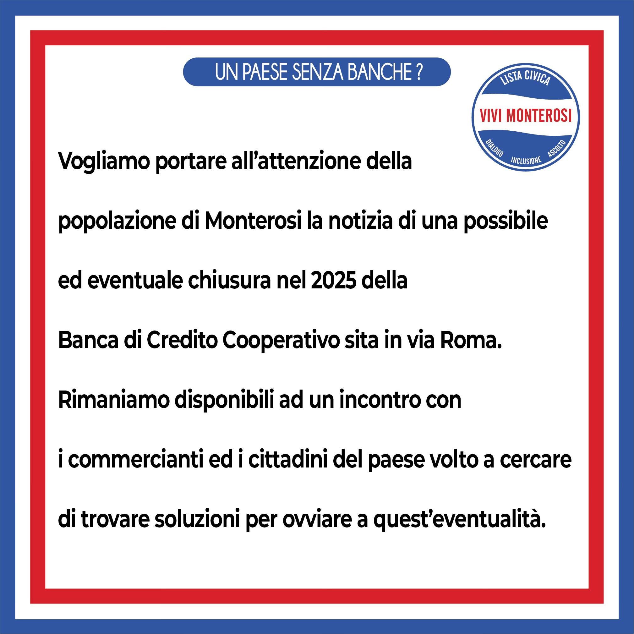 I consiglieri di minoranza “Vivi Monterosi”, attraverso una pagina Facebook creata lo scorso 28 ottobre, hanno lanciato un allarme riguardo alla possibile ed eventuale chiusura della filiale della Banca di Credito Cooperativo (BCC) situata in via Roma. Nel comunicato pubblicato, i consiglieri hanno espresso preoccupazione per quella che definiscono una potenziale chiusura prevista per il 2025. La notizia arriva dopo una già recente chiusura della filiale di Intesa San Paolo, che ha lasciato il paese con un servizio bancario limitato.